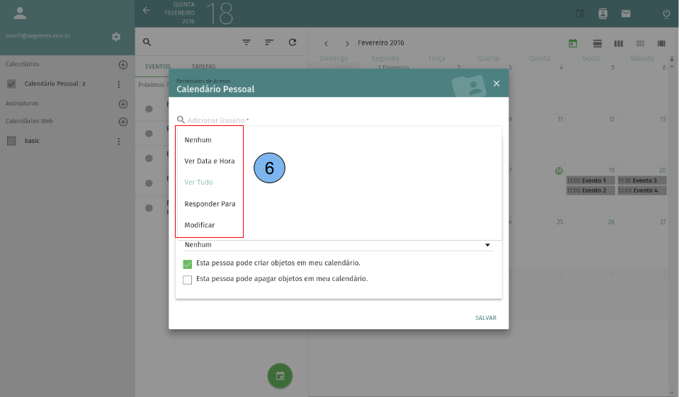 (5) Marque a opção “Usuário inscrito”. (6) Defina as permissões que esse usuário terá sobre o seu calendário. (7) Clique em “Salvar”.