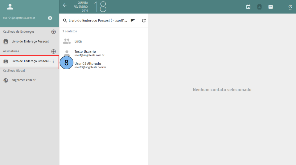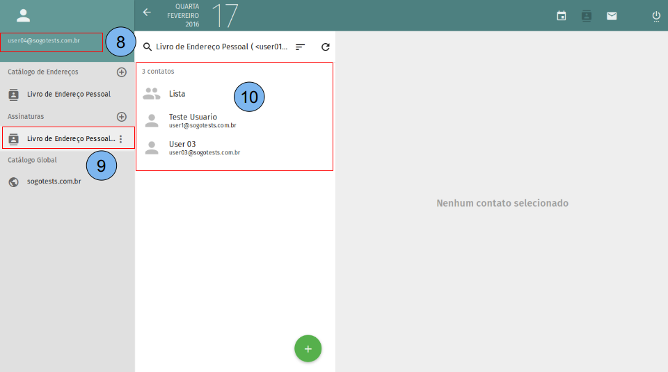 Ao acessar a conta para onde o catálogo de endereços foi compartilhado (8), veja que o catálogo já aparece para o usuário (9), ao selecionar o catálogo em questão é possível acessar os endereços cadastrados(10).