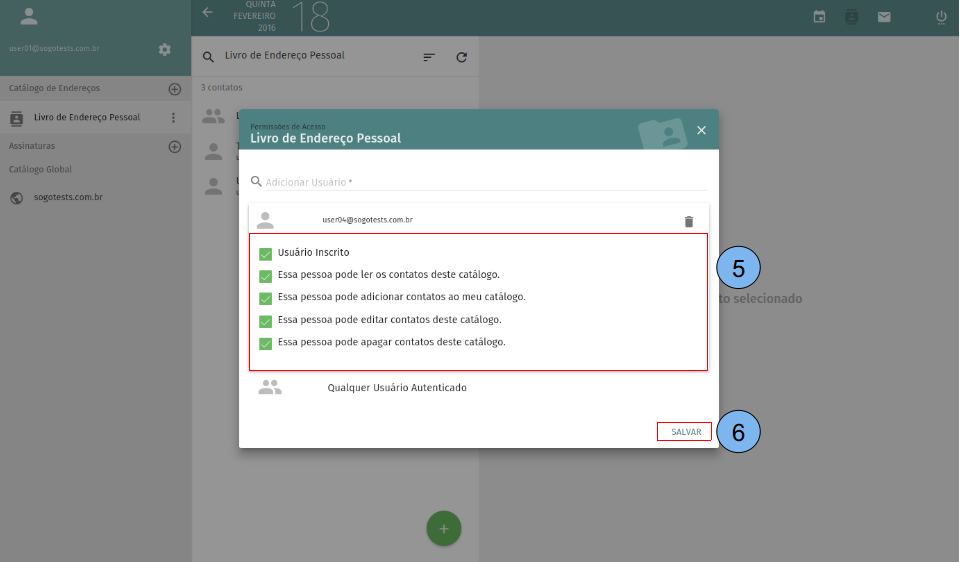 (5) Marque a opção “Usuário inscrito” e defina as permissões que esse usuário terá sobre o seu catálogo. (6) Clique em “Salvar”.