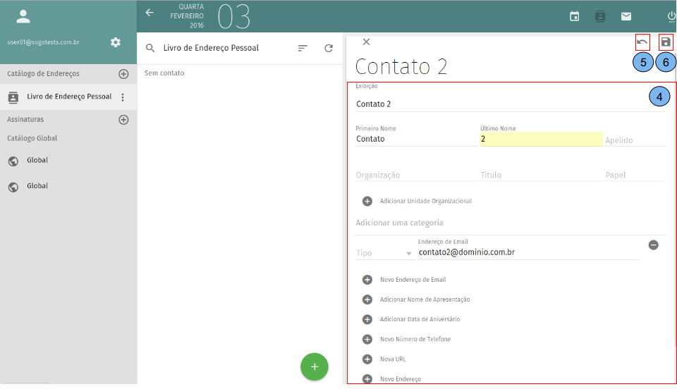 Apresentação da tela inicial do catálogo de endereços. (1)Exibe lista de catálogos, por padrão o “Livro de Endereço Pessoal” já vem criado. (2)Lista de contatos criados no catálogo selecionado no passo (1). (3)Dados do contato selecionado no passo (2). (4)Criar novo contato.
