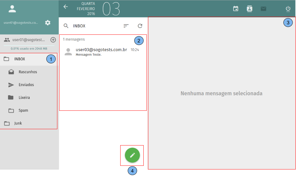 Na página inicial da tela de correio temos: (1)Relação de pastas da conta do usuário. (2)Lista de e-mails de uma pasta. (3)Corpo de um e-mail selecionado. (4)Escrever novo e-mail.