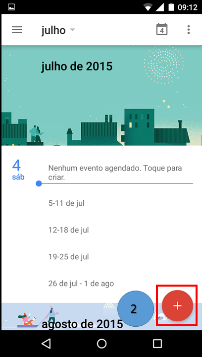 As telas abaixo mostram como criar eventos em dispositivos Android. Abra o aplicativo “Agenda” em seu dispositivo (1).