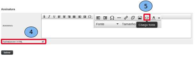Após habilitar a opção “Assinatura em HTML”(4), clique no ícone (< >)(5) para edição do código HTML da assinatura.