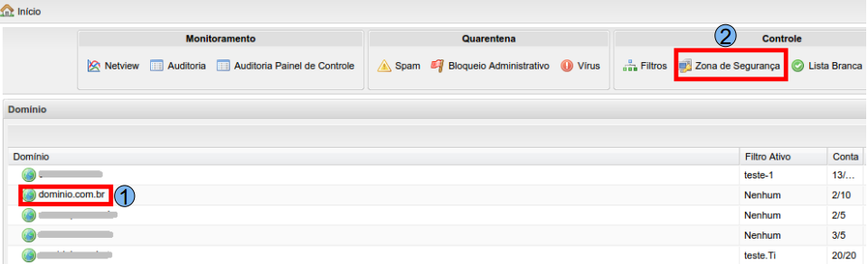 Para iniciar o processo de Configuração de Zona de Segurança de acesso aos e-mails, na tela inicial do Painel de Controle, localize o domínio que será configurado, neste caso, será utilizado “domínio.com.br” (1), em seguida, clique na opção “Zona de Segurança” (2).