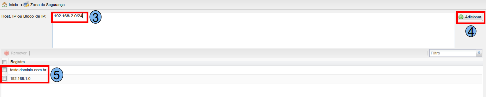Na tela “Zona de Segurança” será atribuída permissão para envio e checagem de e-mails fora da Zona de Segurança definida pelo domínio, podendo inserir um Host, IP ou Bloco de IP (3), após inserir uma das opções mencionadas, clique em “Adicionar” (4), a opção adicionada ficará na parte inferior (5) da tela.