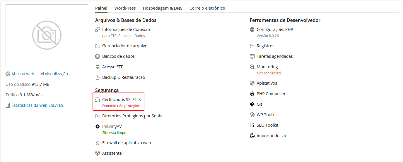- Localize o botão Certificado SSL/TLS e clique nele.