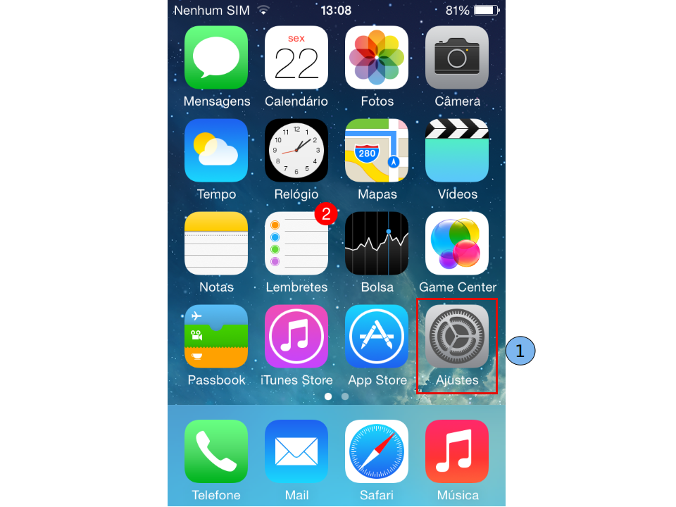 Na tela inicial, acesse "Ajustes" (Settings) (1).
