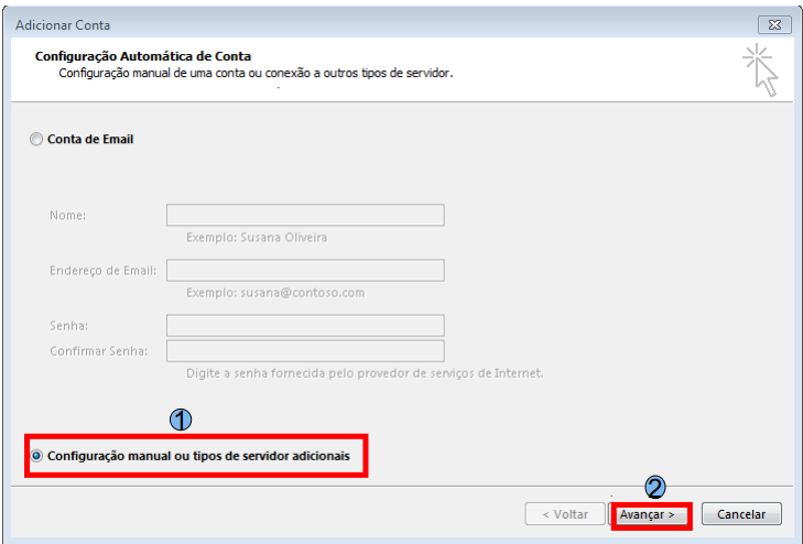 Ao iniciar o Microsoft Outlook, será exibida a tela de configuração de conta de e-mail (caso não possua nenhuma conta de e-mail configurada), clique na opção Configuração manual (1) e em seguida Avançar (2).