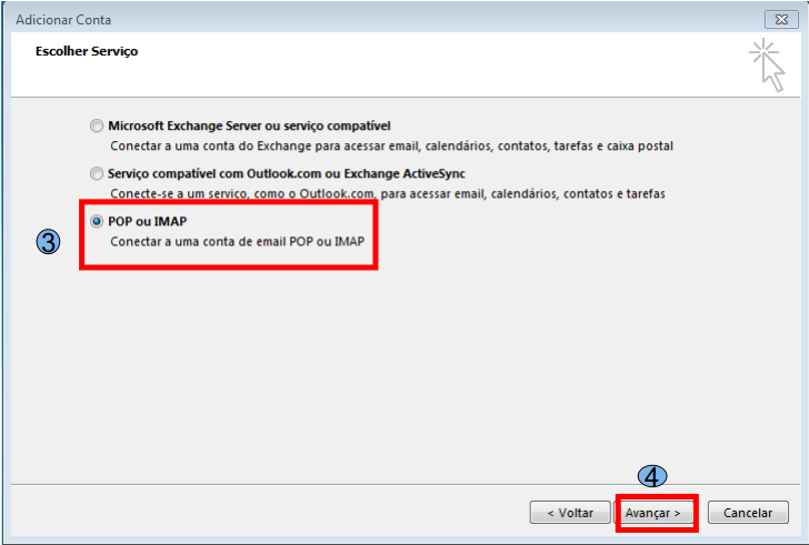 Na tela abaixo marque a opção POP ou IMAP (3) e depois clique em Avançar (4).