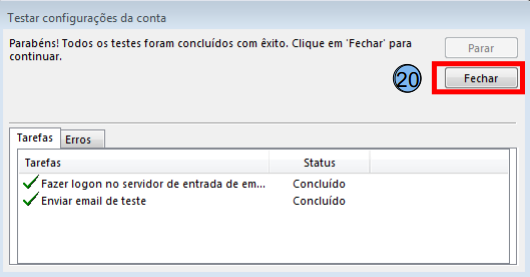 Nesta tela será feito o teste de envio e recebimento de e-mails, o status Concluído indica que a configuração está correta, basta agora clicar em Fechar (20).