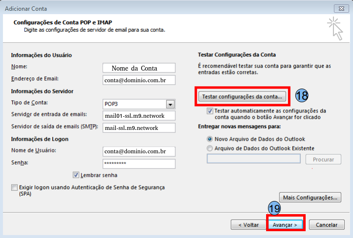 Na janela de configurações da conta, clique em Testar configurações da conta (18) e em seguida clique em Avançar (19).