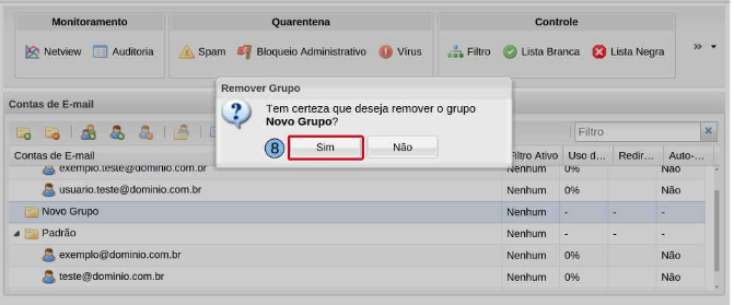 Confirme a solicitação para a remoção do grupo clicando na opção “Sim”(8).